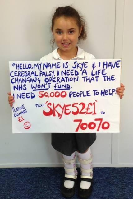 Max George retweeted a tweet from the account @HelpFundSkye. Skye is a young girl with Cerebral Palsy who needs a life-changing operation that Britain's National Health Service will not fund. Skye needs 50,000 people to help. Specifically, she needs 50,000 people to donate 1 pound ao that she can get the operation. Max George retweeted a tweet that had all of the information above in it.